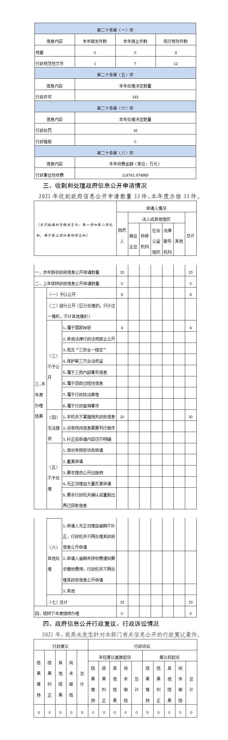 (二)執法行政公開情況。2021年行政許可處理決定數量143件,行政處罰處理決定數量16件;
