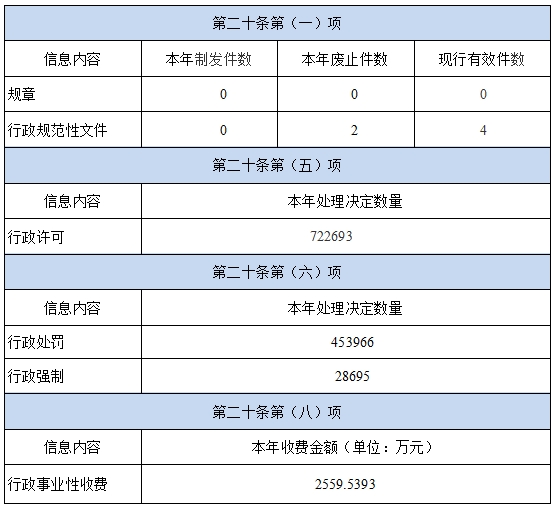 我局2024年無新增行政規范性文件,廢止2件,現行有效4件。行政許可數量為722693,行政處罰數量為453966,行政強制數量為28695,行政事業性收費2559.5393萬元。