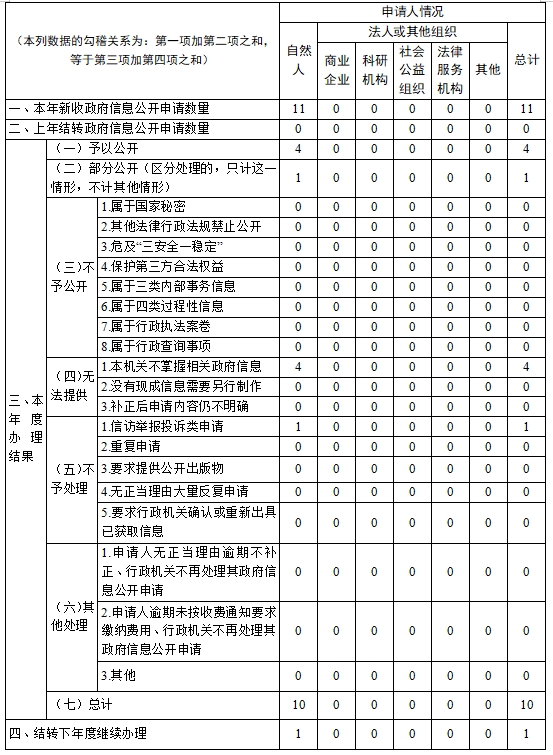 2024年,我局共收到依申請公開11件,均為自然人申請,10件全部按期依法答復,其中予以公開4件,部分公開1件,本機關不掌握相關政府信息或不存在4件,信訪舉報投訴類1件。1件結轉至2025年度辦理。