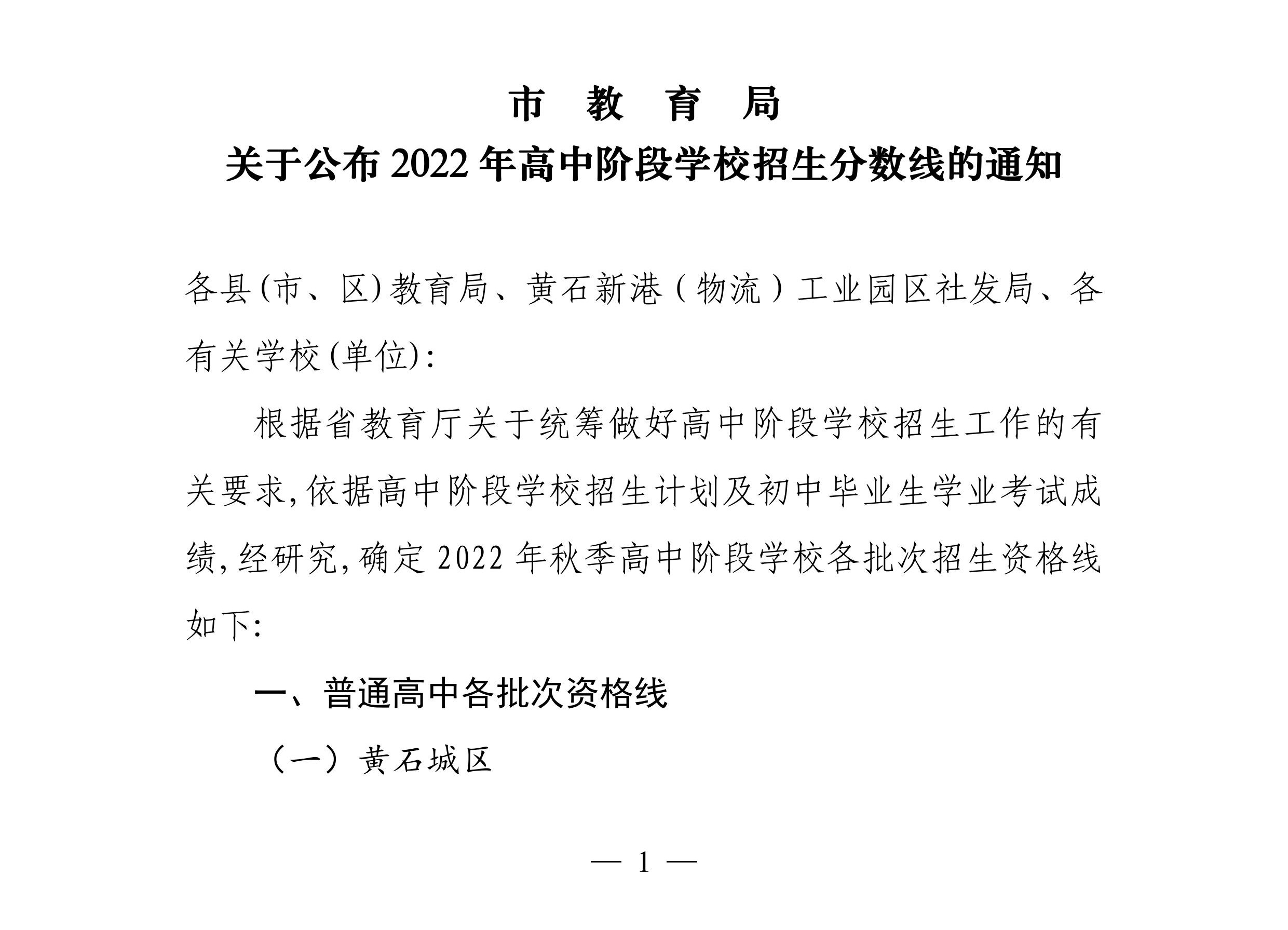 2022年黃石市高中階段招生分數線