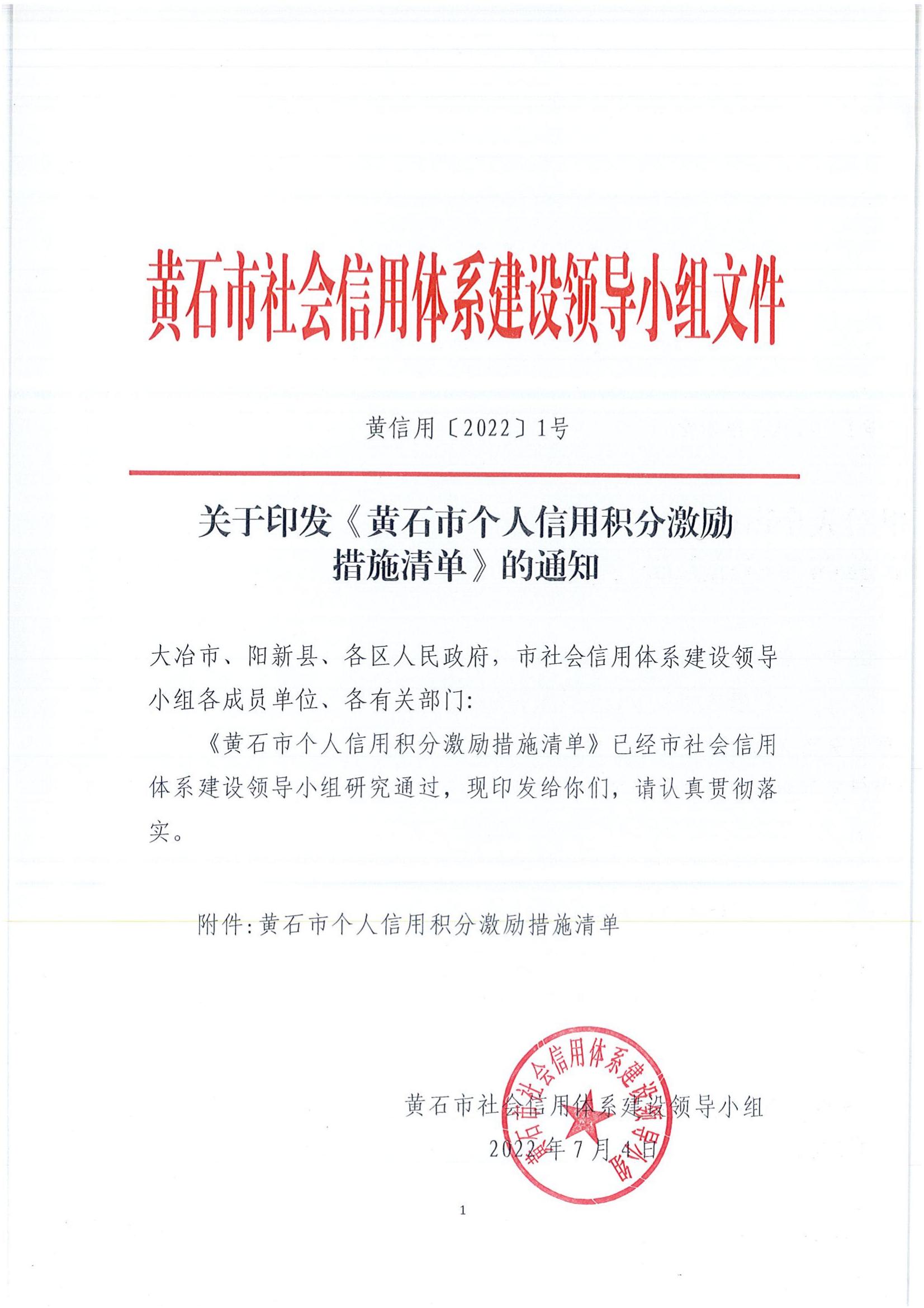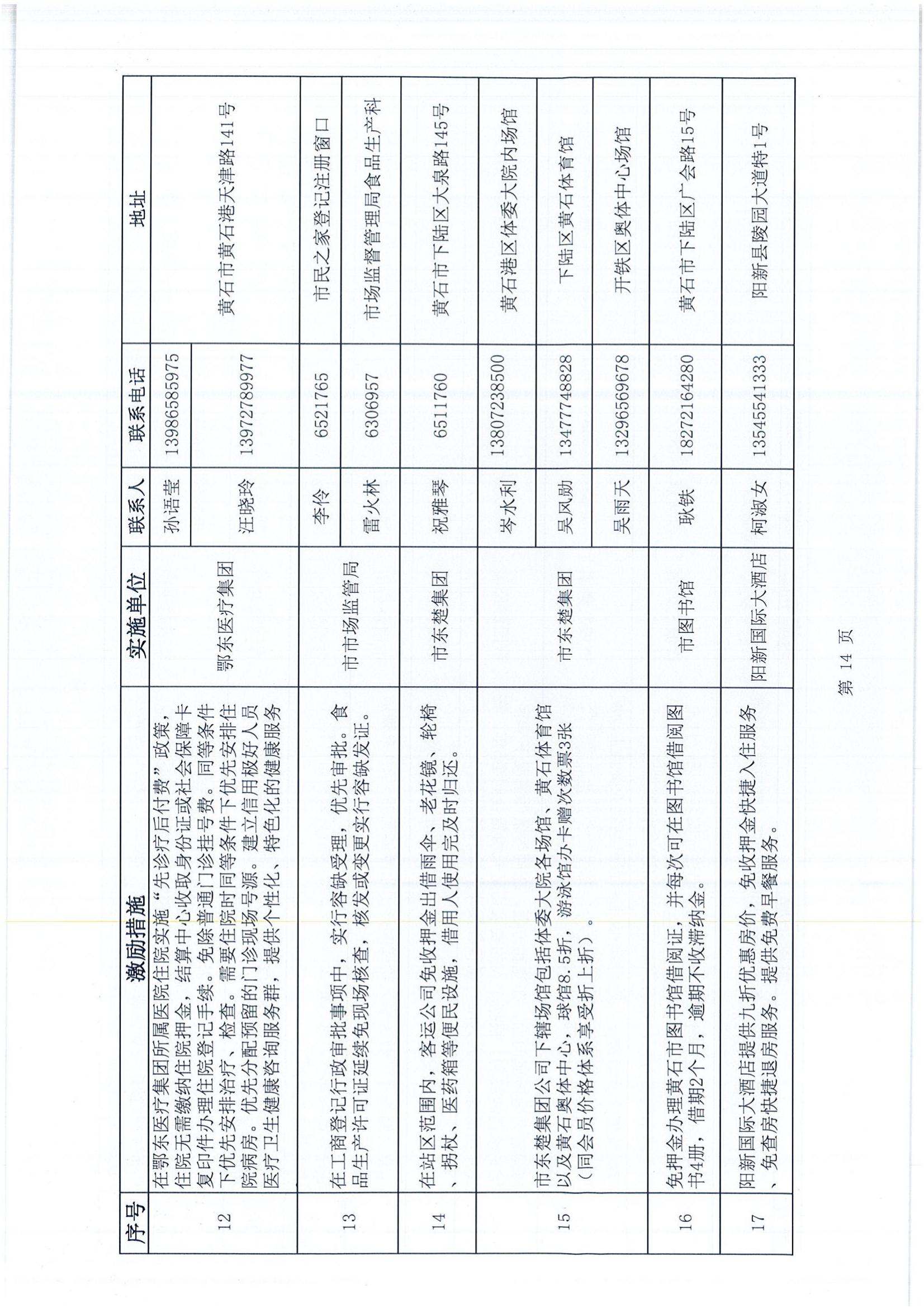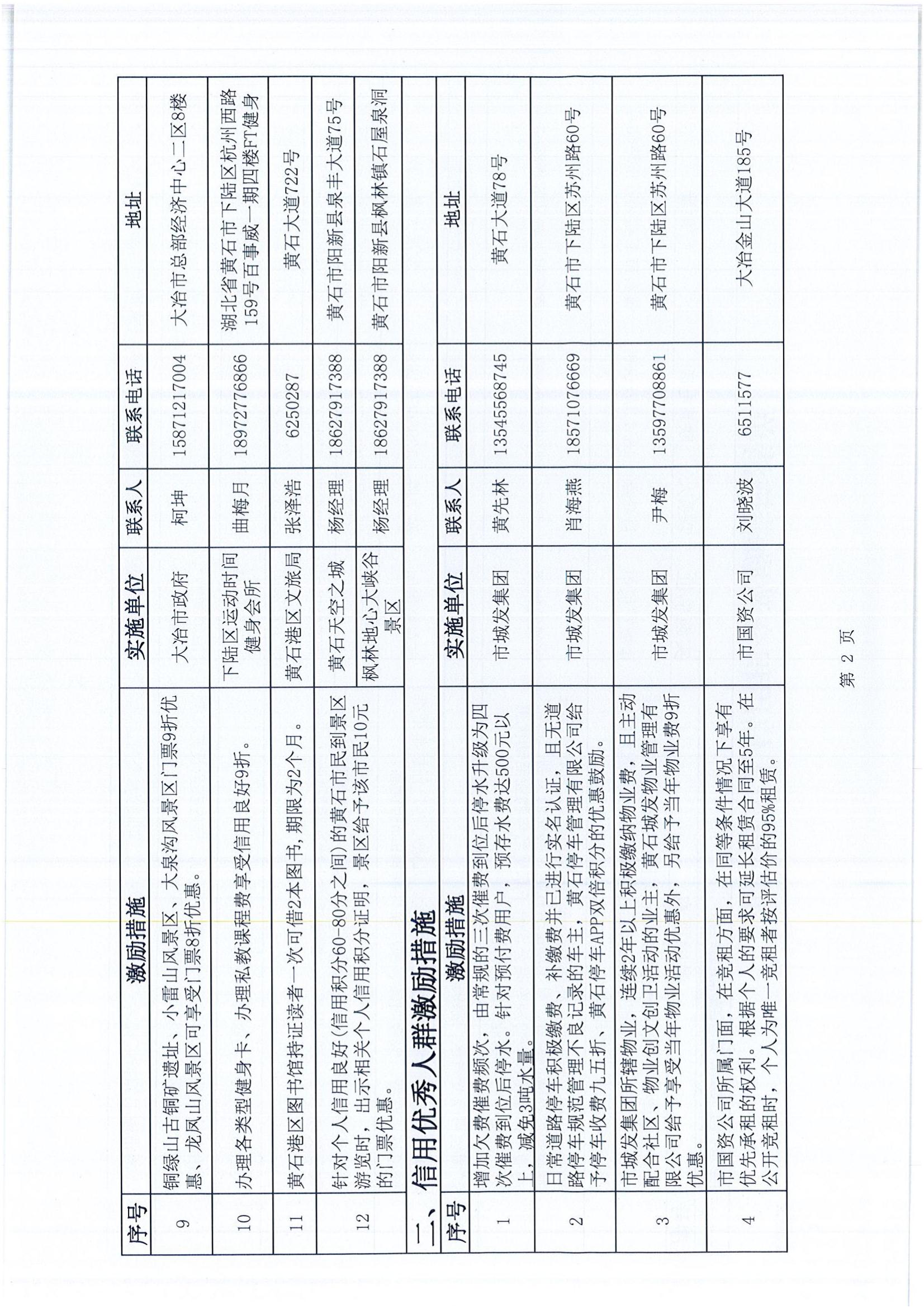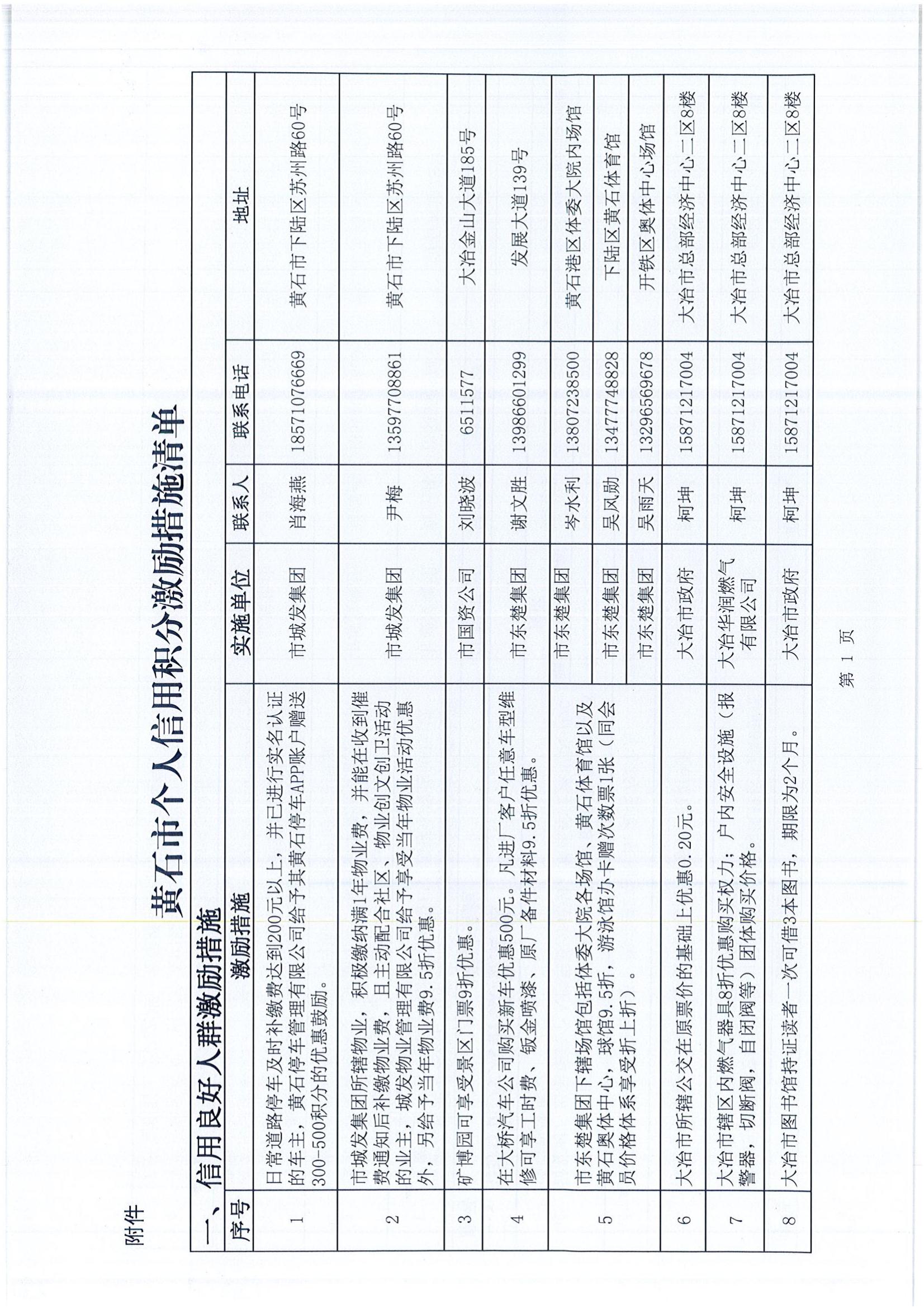 黃石市個人信用積分激勵措施清單